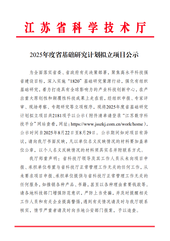近日,江苏省科学技术厅公布
